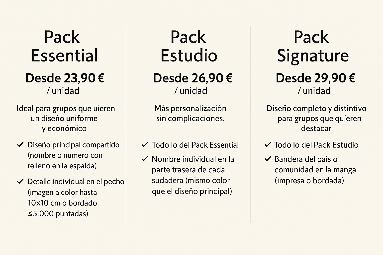 Ofrecemos tres packs para grupos que se adaptan a diferentes estilos: